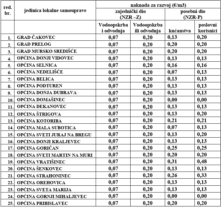 - Naknada za razvoj – propisana je Zakonom o financiranju vodnog gospodarstva i naplaćuje se temeljem odluke isporučitelja vodnih usluga, a prihod je Međimurskih voda uz namjensko trošenje za razvoj vodno-komunalne infrastrukture. Sastoji se od zajedničkog dijela naknade za razvoj (na uslužnom području) i posebnog dijela naknade za razvoj (na području jedinice lokalne samouprave). Zajednički i posebni dio naknade za razvoj plaća se ovisno o iznosu kako je određeno na području određene jedinice lokalne samouprave te iznosi: